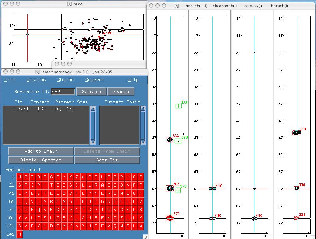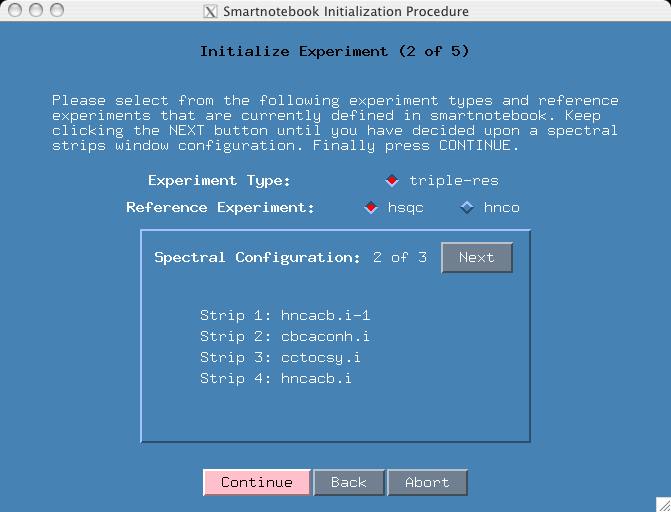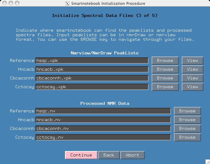 > cd hsqc-cctocsy > snbview When nmrview comes up, type "snb" at the nmrview console.To configure snb for cctocsy data all you need to do that is different from basic setup is select "Spectral Configuration 2 of 4" in the "Initialization procedure (2 of 6)". . When you do this you will notice that the next screen will prompt the user to enter a cctocsy.xpk and cctocsy.nv file as shown.