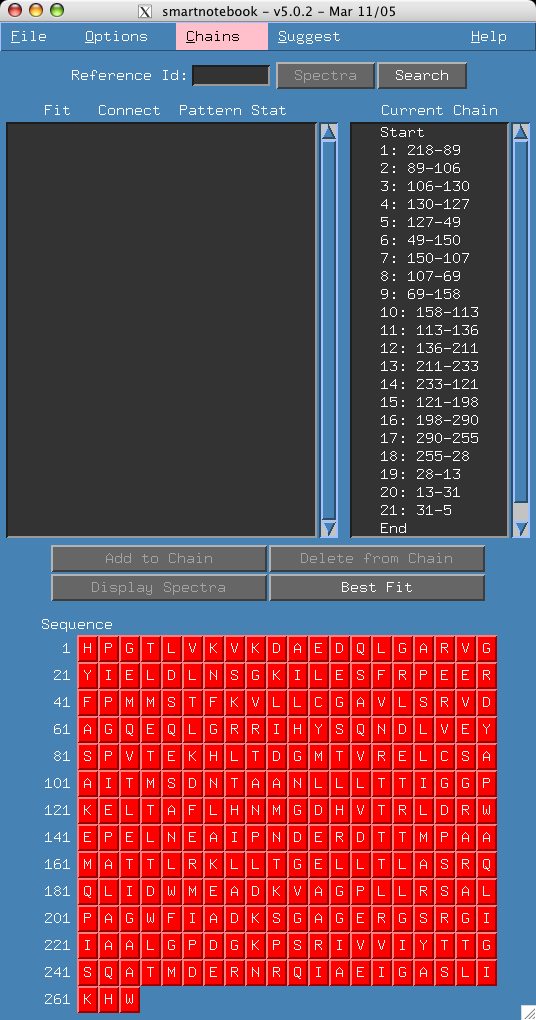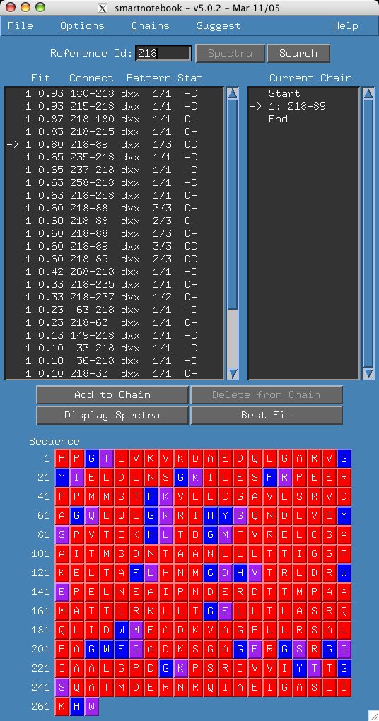 Enter 218 in the "Reference Id" field and press return. Here the correct choice is fifth on the list. Select it and click "add to chain". Click "End" in the Current Chain panel and this time our correct choice is first. Feel free to go through the entire chain, trying some of the incorrect answers and displaying the spectra. Remember that you have the "Delete from chain" button that will allow you to backtrack.