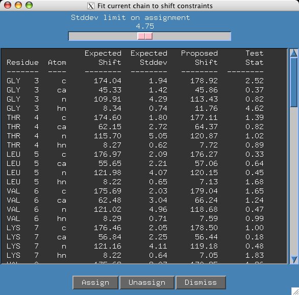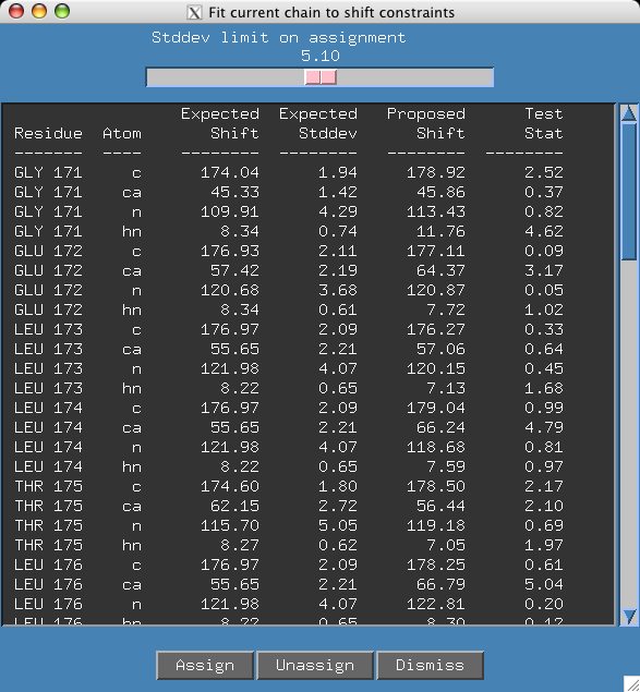 It appears we have an unambiguous assignment but if we move the slider a bit further to 5.10 a second assignment appears. If you click on the "G171" residue in the sequence panel it is easy to see that several shifts do not have good agreement between proposed and expected values.