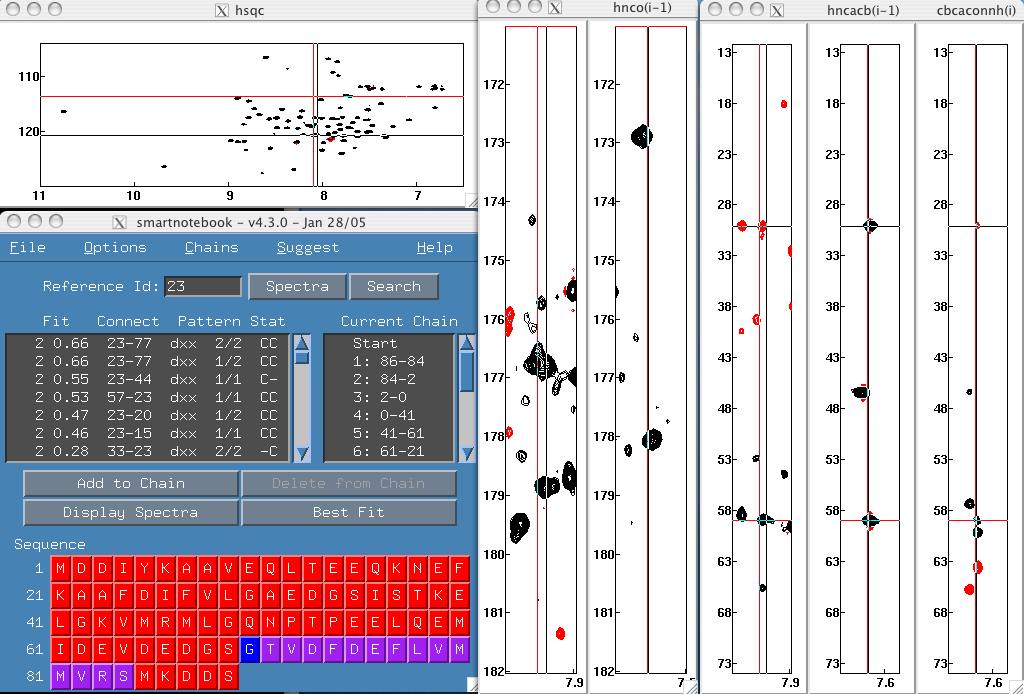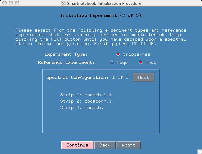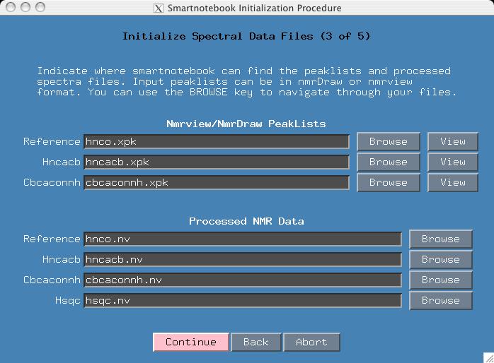 > cd hnco-mxl > snbview When nmrview comes up, type "snb" at the nmrview console.To configure snb for hnco data all you need to do that is different from basic setup is select the hnco Reference button in "Initialization procedure (2 of 6)". Fig. 1 . When you do this you will notice that the next screen will prompt the user to enter a hnco.xpk and hnco.nv file. Fig. 2 .