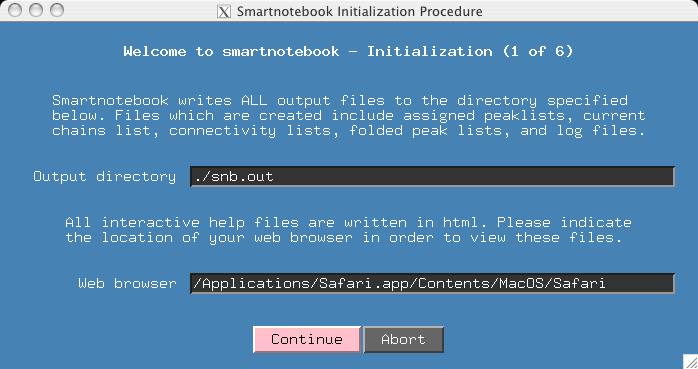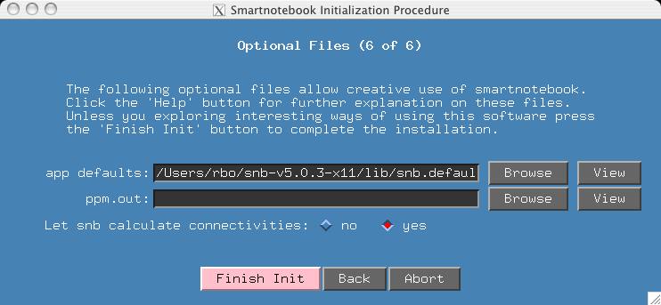 This section deals with options. If you have customized colors and fonts for your smartnotebook environment, you may wish to import your own "AppDefaults" file. If you have an input ppm.out file where some atoms have been assigned, and you want the output ppm.out file to contain these assignments, then input your ppm.out file here. Please note that in the case of conflict between assignments made in snb and the input ppm.out file, the snb assignments will take precedence. Finally, it is possible you do not want snb to calculate connectivities because you plan to import your own (select the 'no' button in this case).