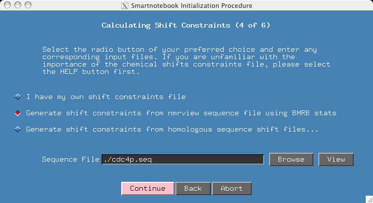 This section is more complex, so you may want to click the HELP button to know all your options. But for the purposes of this demo, we do not have the homologous shift files which would more tightly constrain expected shift values. If you have homologous shift data, then you will want to try the example presented later on in this section. If you select the middle radiobutton and if the name of your sequence input file ends in ".seq", then snb will be able to fill in the "Sequence File" entry. Press CONTINUE.