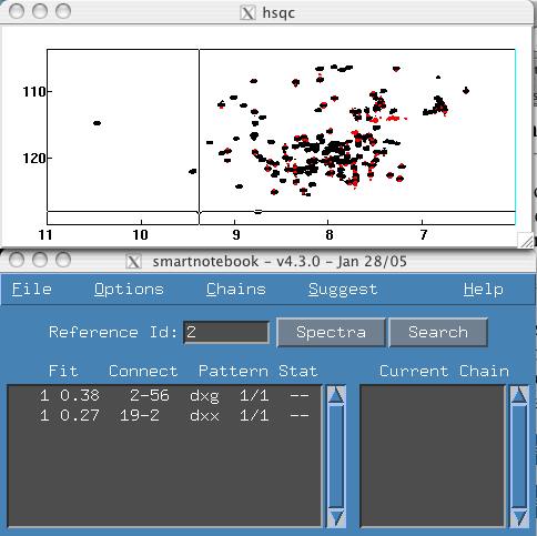 If your data includes an hsqc spectra, then another way to select a reference peak is to click the leftmost mouse button on the desired peak in the spectra (eg, set crosshairs on the interesting peak). Then click on the button "Spectra". The software finds the closest peak to your mouse click and the reference ID number is shown in the entry box. If you do not have an hsqc spectra, then the "spectra" button is disabled. Remember snb and nmrview software work separately, an event in an nmrview window cannot update the snb panel directly, hence the click on the Spectra button.